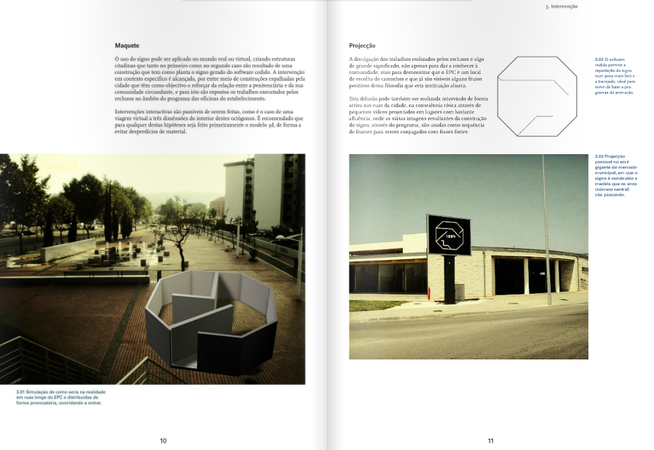 Right: Digital simulation of what could be a street intervention in Coimbra in which the people would be invited to enter in these structures to see works done by the convicts.